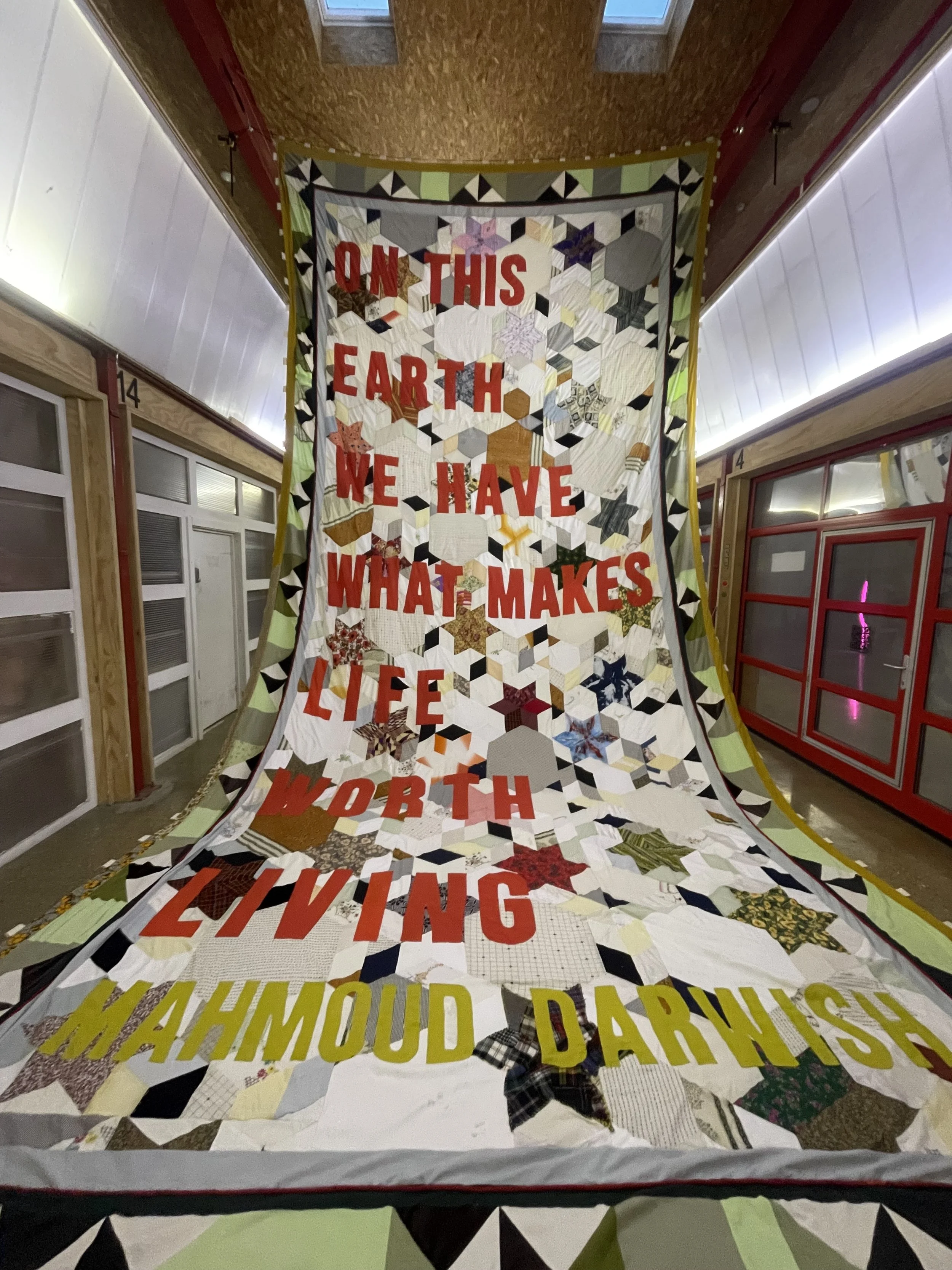 Over the past nine months, we've created this banner collectively, hand-sewing words by Mahmoud Darwish, a poet cherished across Palestine and the world for his humanity, love, and ability to imagine connection beyond borders.